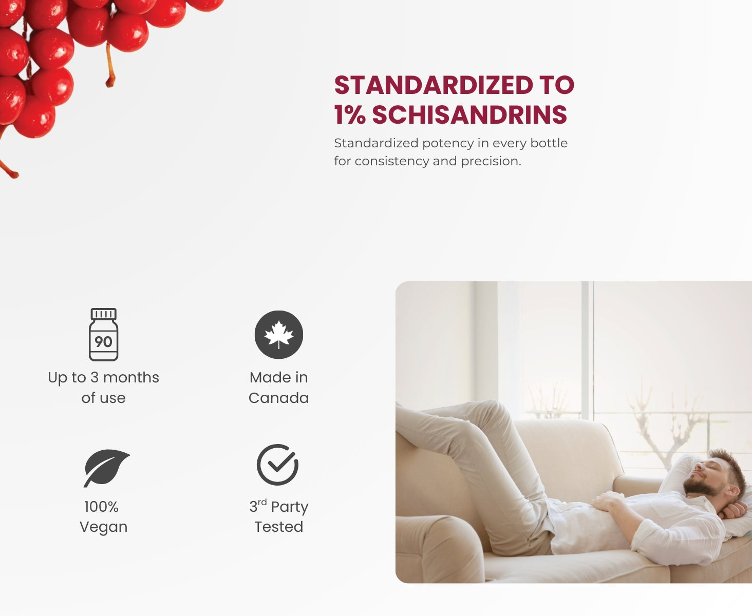 A. Standardization ensures consistent levels of key active compounds in every batch. Our formula is standardized to contain 1% Schisandrin, one of the primary lignans found in Schisandra berries. This guarantees you receive the same potency whether you purchase your first bottle or your tenth.